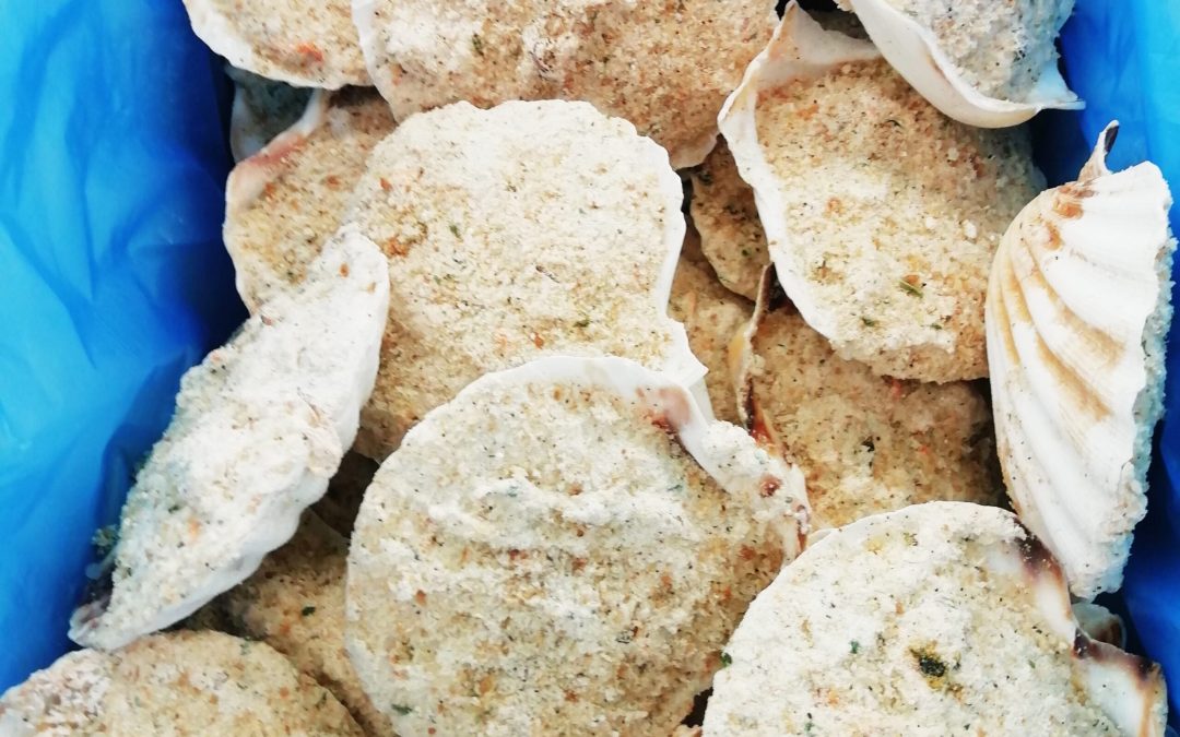 Ventagli di mare gratinati (cappesante e gamberi panati)